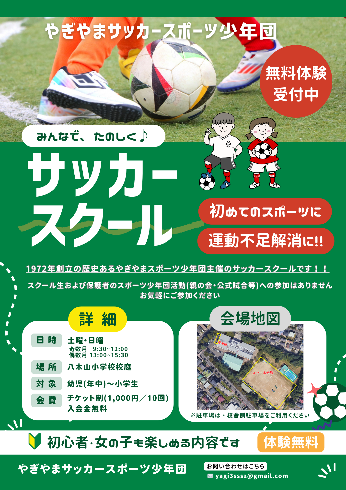 スクール生募集中! お知らせ 2025.02.262026.02.06 やぎやまSCでは、スクール生を随時募集しておりす! スクール生とその保護者様は、スポーツ少年団活動(親の会・公式試合等)への参加はありません。 練習時の付き添いも必要ありませんので、お気軽にご参加ください。
